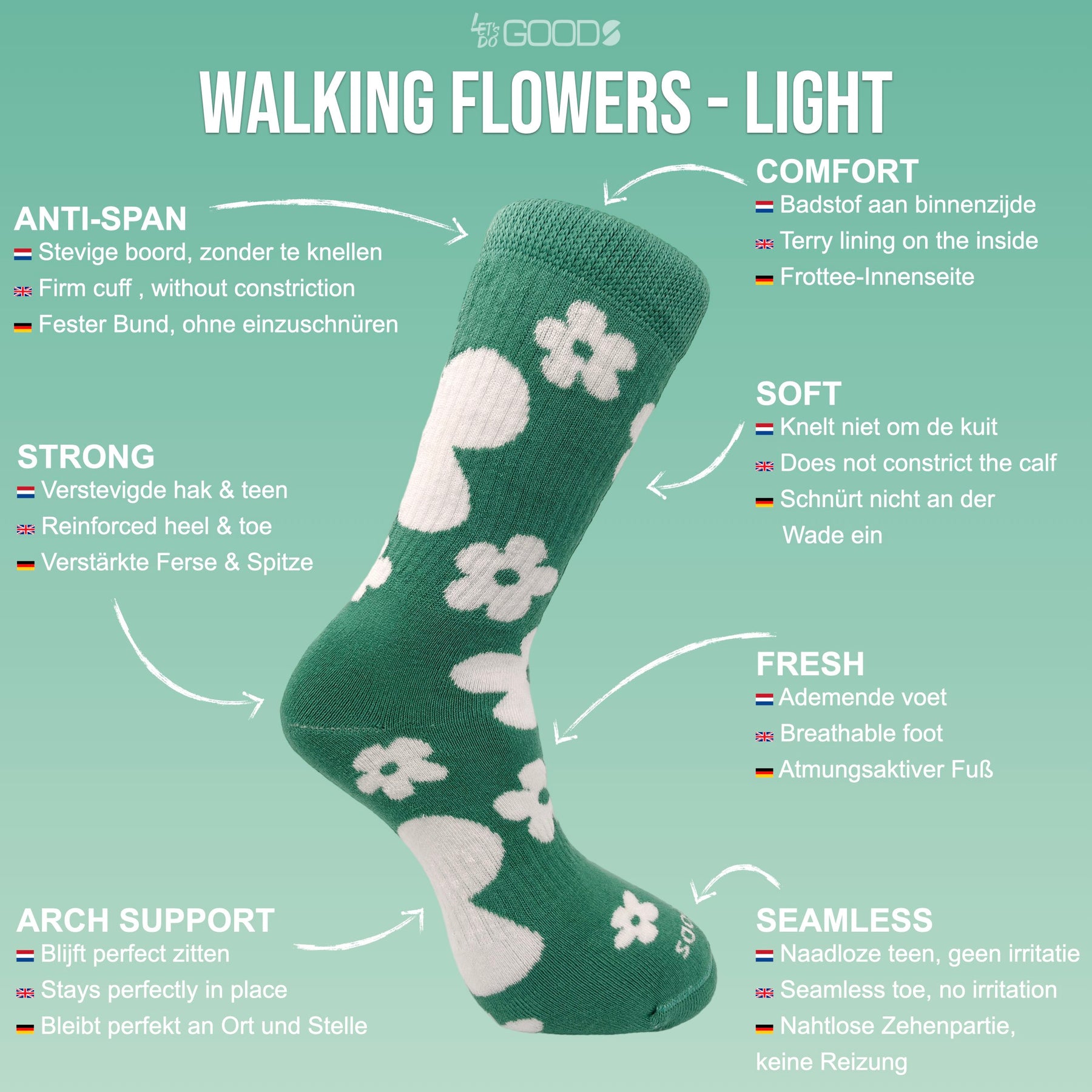 Die „Fußgewölbestütze“ um die Mitte Ihres Spanns schmiegt sich an Ihren Fuß und sorgt dafür, dass die Socken an Ort und Stelle bleiben. -