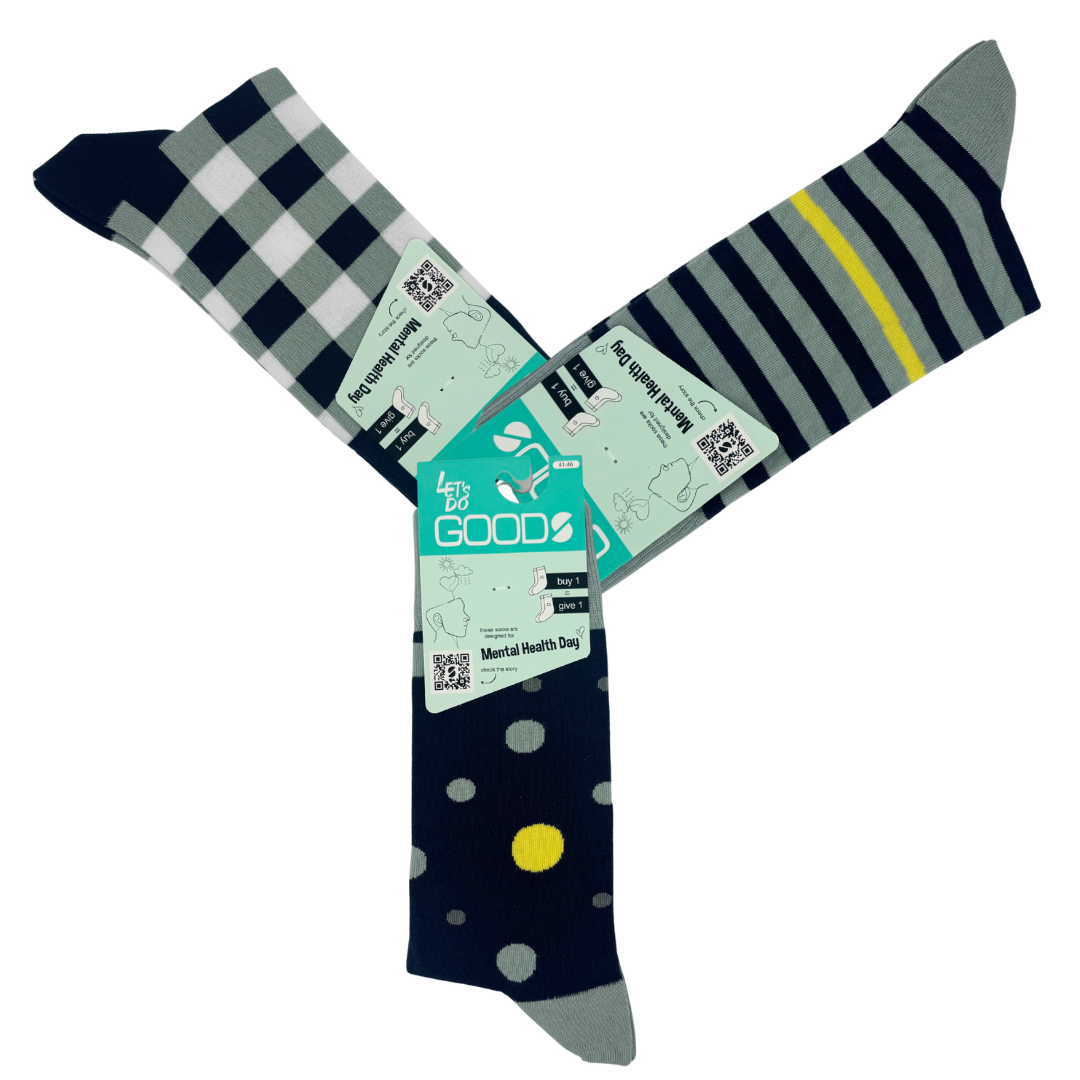 We designed these socks together with our artists for Mental Health Day. This pair is part of a collection of three designs. Designs in traditional, recognizable patterns where one element stands out, simply because it is different. Being different gives color to the world, and to these beautiful socks. Mental health is one of the leading causes of homelessness, which is why we support Mental Health Day.