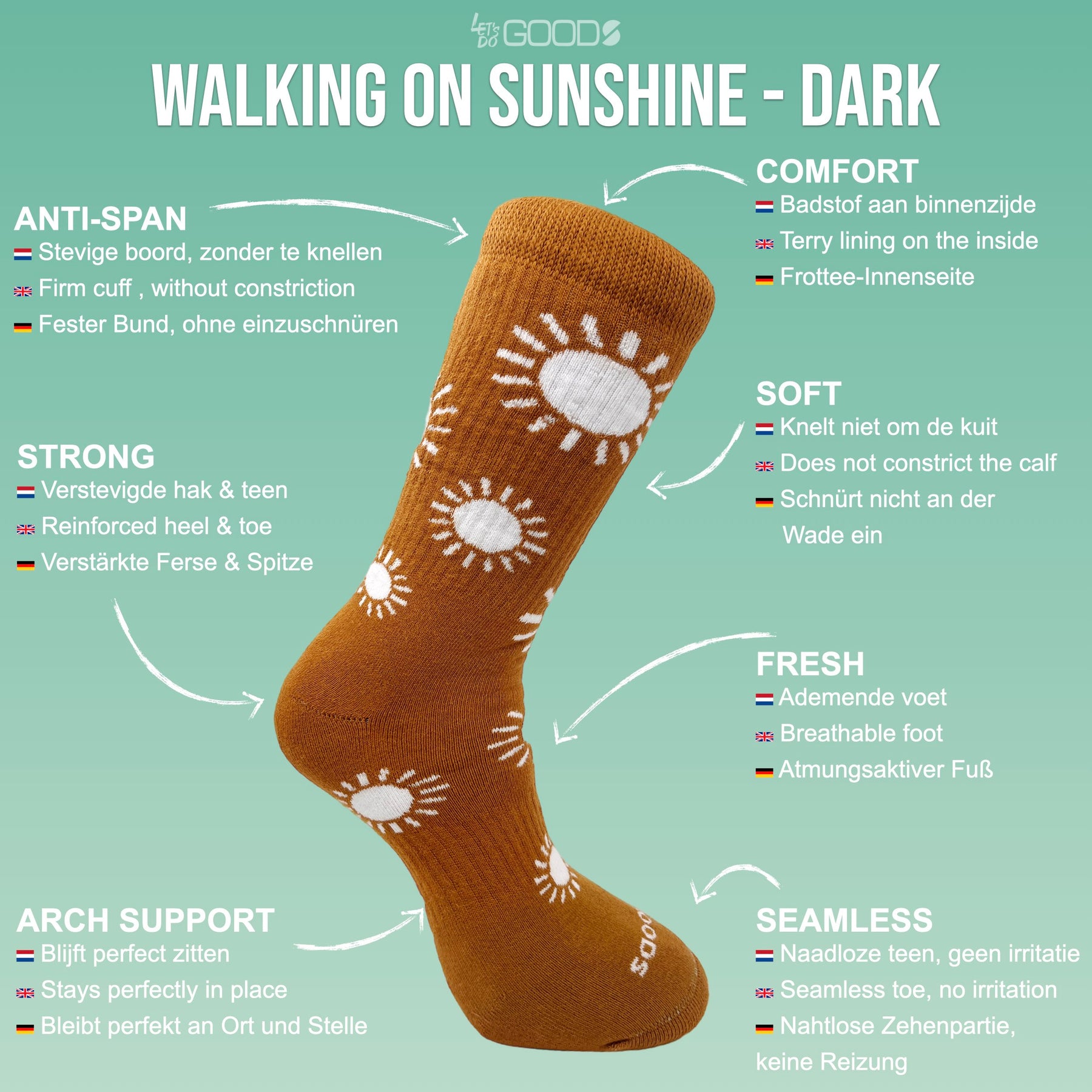 These walking socks from Goods were developed together with people from the homeless community. Their feedback, ideas and suggestions can be found in the technical elements of these socks. The result is a walking sock that is good for your feet and those of others, because....