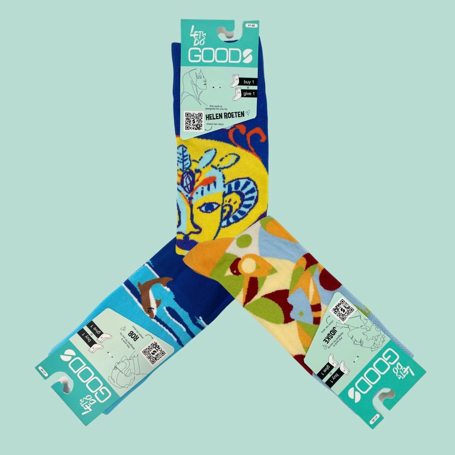 Wanneer jij deze bundel met drie kunstwerken aanschaft, worden er in onze Social Sock Factory in Den Haag ook drie paar donatie sokken gemaakt. Hier bieden we mensen met een grote afstand tot de arbeidsmarkt een kans op werk en herstel.
